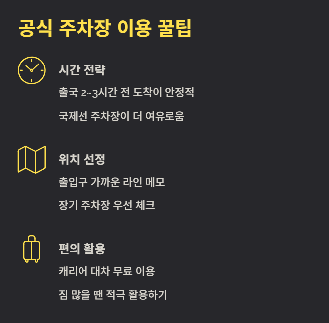 주차를 반드시 예약하고 싶다면 민간 주차대행 서비스가 유일한 방법이며, 장기 여행자에게는 편리하고 경제적입니다. 다만 업체 선택이 매우 중요하므로 후기·보험·관리 시스템을 꼭 확인해야 합니다. 공식 주차장은 단기 이용에 가장 안정적이며 실시간 주차현황 확인이 핵심입니다.