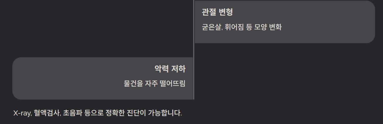 - 퇴행성관절염(골관절염): 중·장년층에서 가장 흔하며, 아침 뻣뻣함과 변형이 함께 나타나는 경우가 많습니다.