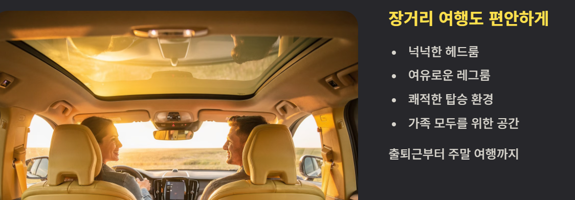- 전면 및 후면 탑승자의 머리 공간(headroom)도 충분히 확보되어 있어, 장시간 운전이나 이동 시에도 쾌적함이 기대됩니다.