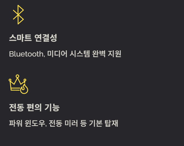 - 파워 윈도우, 전좌석 원터치 작동, 전동 접이 및 조절 가능한 외부 미러 등 기본적인 편의 기능을 갖추고 있습니다.