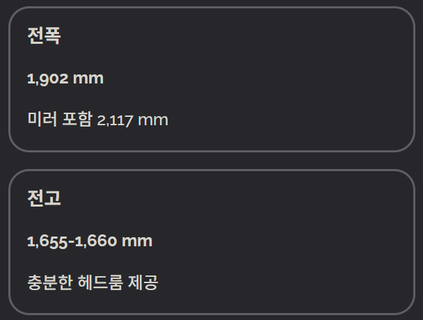 - 실제 주차 공간 / 차고 입출고 시폭을 고려: 전폭이 넓은 만큼, 도심 주차나 좁은 공간에서 미러 포함 폭을 꼭 체크해야 합니다.
