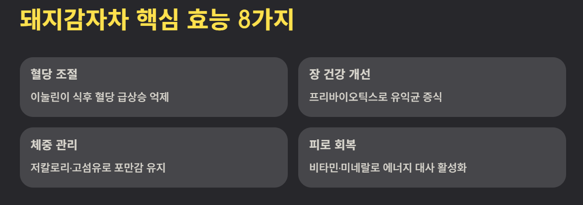 요즘 건강 음료로 많은 사랑을 받고 있는 돼지감자차는 혈당 관리와 장 건강에 특히 도움이 되는 식품으로 알려져 있습니다. 돼지감자에는 이눌린이라는 성분이 풍부하게 들어 있어 당 흡수를 늦추고 소화 기능을 돕는 데 큰 역할을 한다고 알려져 있습니다. 또한 차 형태로 꾸준히 마시면 부담 없이 하루 수분 섭취를 늘릴 수 있어 건강 생활에 쉽게 적용할 수 있습니다.