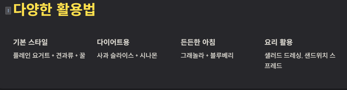 - 가장 기본: 플레인 그릭 요거트 + 견과류 + 꿀 한 스푼