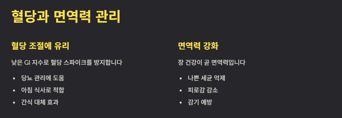 그릭 요거트는 당분이 적고 GI 지수가 낮아 혈당을 급격히 올리지 않는 식품입니다. 당 관리가 필요한 사람에게 특히 좋은 선택이며, 아침 식사나 간식으로 먹어도 혈당 스파이크를 줄일 수 있습니다.