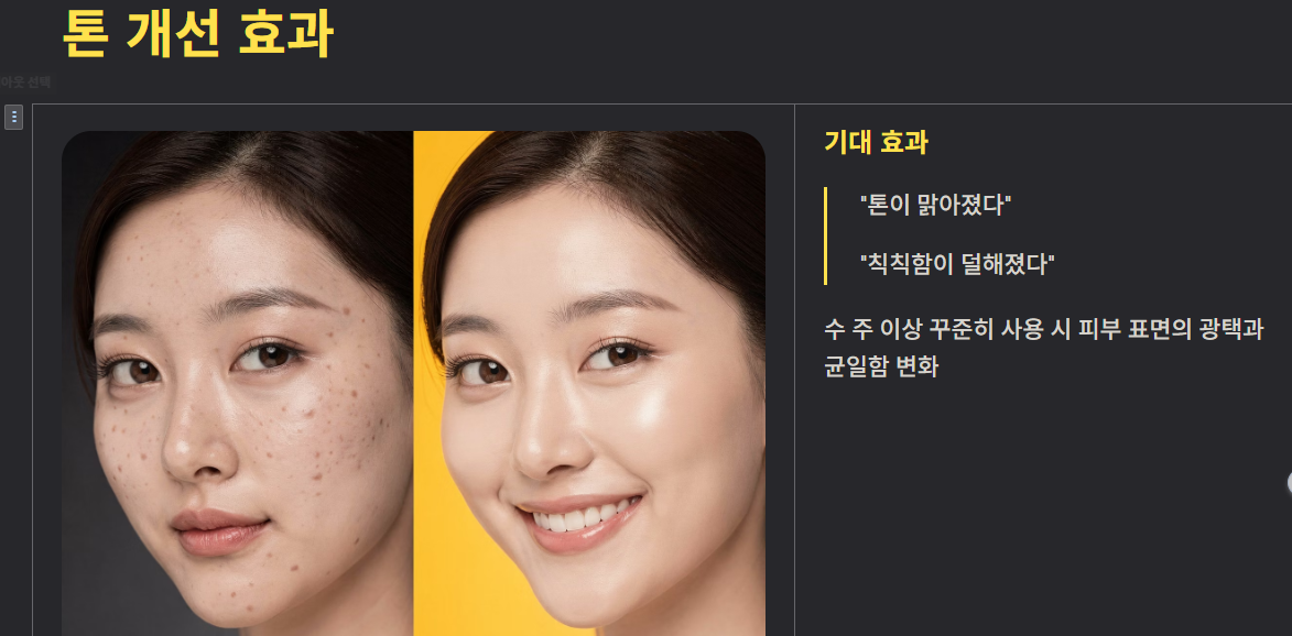 사용자 후기에 자주 등장하는 표현은 “톤이 맑아졌다”, “칙칙함이 덜해졌다”는 반응입니다. 수 주 이상 꾸준히 사용할 경우 피부 표면의 광택과 균일함 변화가 눈에 띄었다는 내용이 많습니다. 즉각적인 미백 효과보다는 부드럽게 밝아지는 변화가 특징입니다.