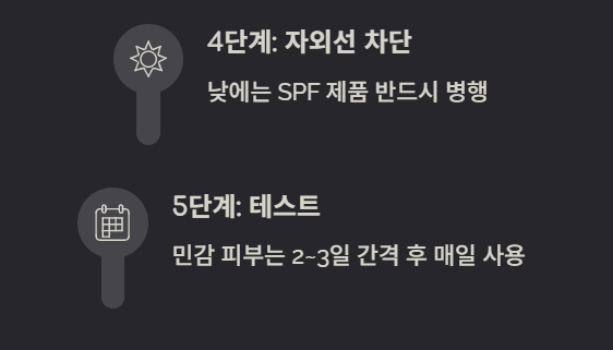 - 민감 피부는 2~3일 간격 테스트 후 매일 사용으로 전환