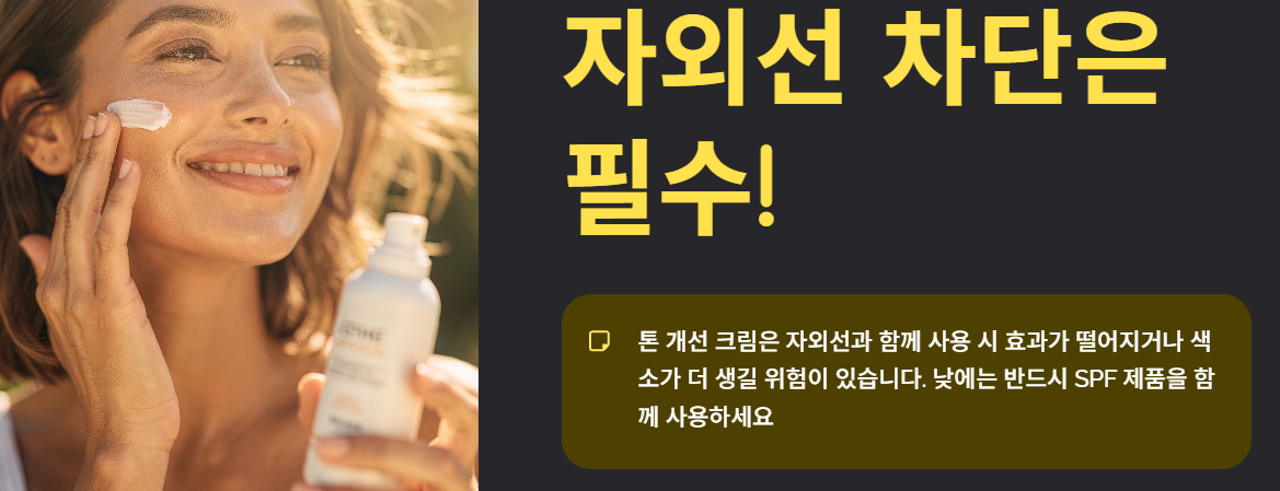 특히 톤 개선 크림은 자외선과 함께 사용할 경우 효과가 떨어지거나 색소가 더 생길 위험이 있어, 낮에는 반드시 SPF 제품과 함께 사용해야 합니다.