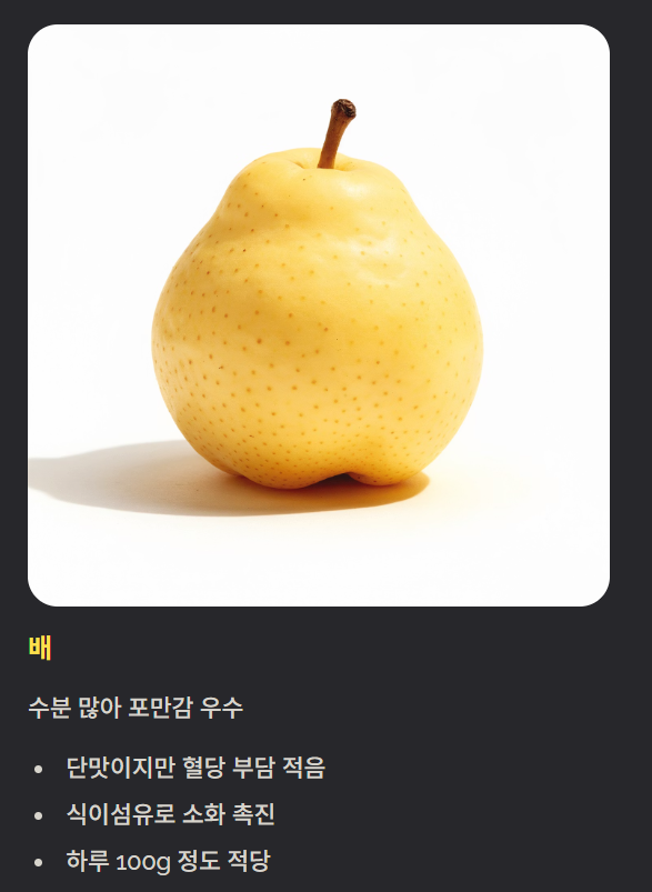 배는 단맛이 있지만 수분량이 많아 다른 과일보다 혈당 부담이 적습니다.