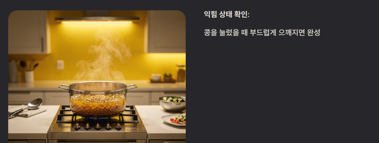익힘 상태는 콩을 눌렀을 때 부드럽게 으깨지는지로 판단할 수 있습니다.
