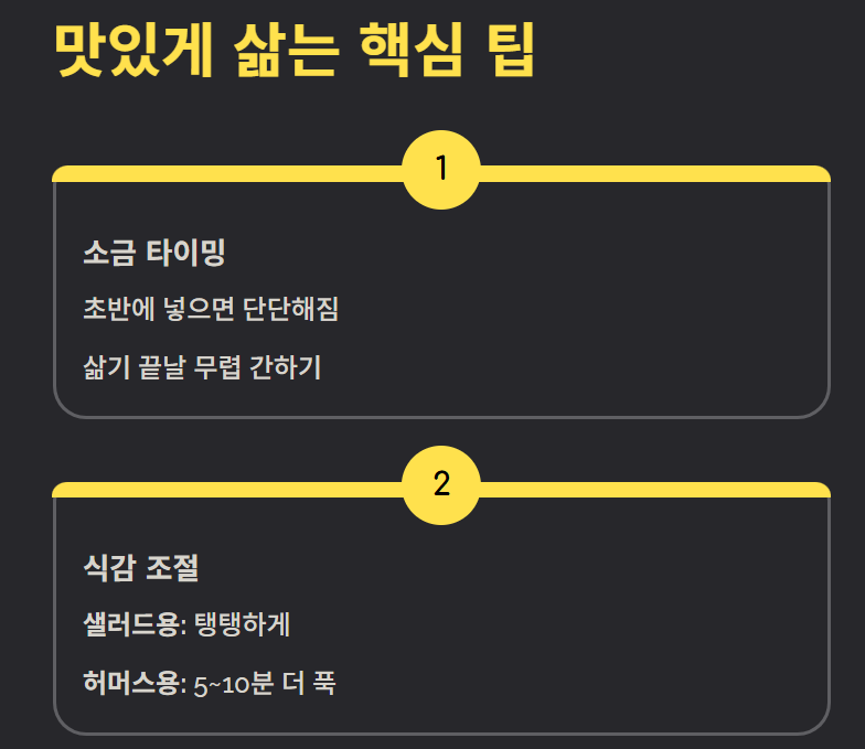 - 삶을 때 소금은 초반에 넣지 말기 → 단단해져 익는 시간이 길어짐