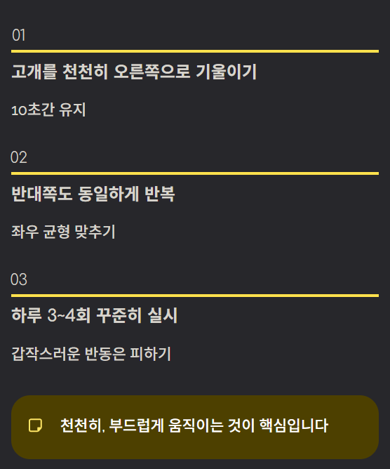 - 고개를 천천히 오른쪽으로 기울여 10초 유지