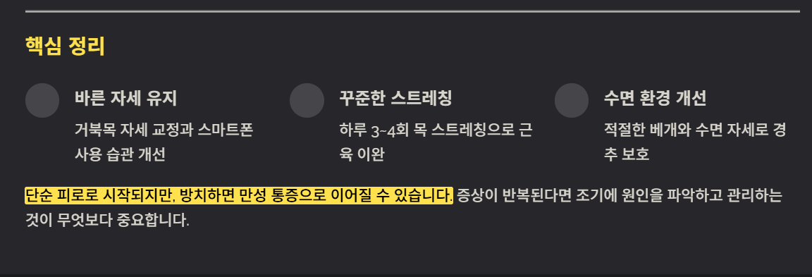 뒷목이 뻐근한 증상은 단순 피로에서 시작되지만, 방치하면 만성 통증으로 이어질 수 있습니다. 평소 바른 자세 유지, 스트레칭, 수면 환경 개선만으로도 충분히 예방과 완화가 가능합니다. 증상이 반복된다면 조기에 원인을 파악하고 관리하는 것이 무엇보다 중요합니다.