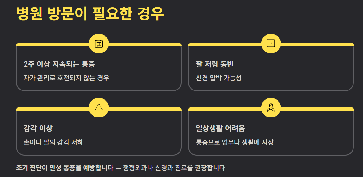 통증이 2주 이상 지속되거나 팔 저림, 감각 이상이 동반된다면 정형외과나 신경과 진료를 권장합니다. 조기 진단이 만성 통증을 예방합니다.