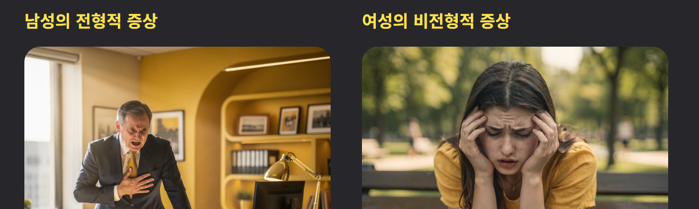 남성은 전형적인 흉통이 많은 반면, 여성은 소화불량, 어지럼증, 심한 피로감 등 비전형적 증상이 나타날 수 있어 놓치기 쉽습니다. 이런 차이로 여성의 심근경색 발견이 늦어지는 경우도 많습니다.