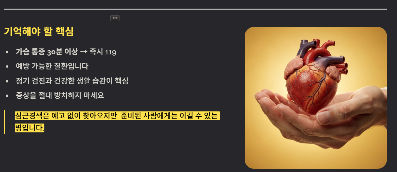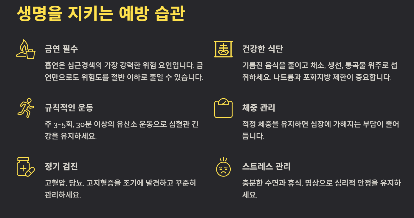 심근경색은 예고 없이 찾아오지만, 사전 지식과 예방 습관으로 충분히 위험을 줄일 수 있습니다. 가슴 통증이나 이상 증상이 느껴진다면 망설이지 말고 즉시 병원을 찾는 것이 생명을 지키는 가장 확실한 방법입니다.