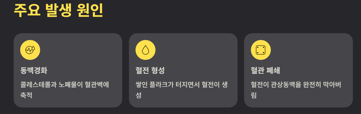 심근경색은 심장에 혈액을 공급하는 관상동맥이 막히면서 심장 근육이 괴사하는 질환입니다. 혈관이 완전히 차단되면 산소 공급이 중단되어 심장 기능에 심각한 손상을 남길 수 있습니다.