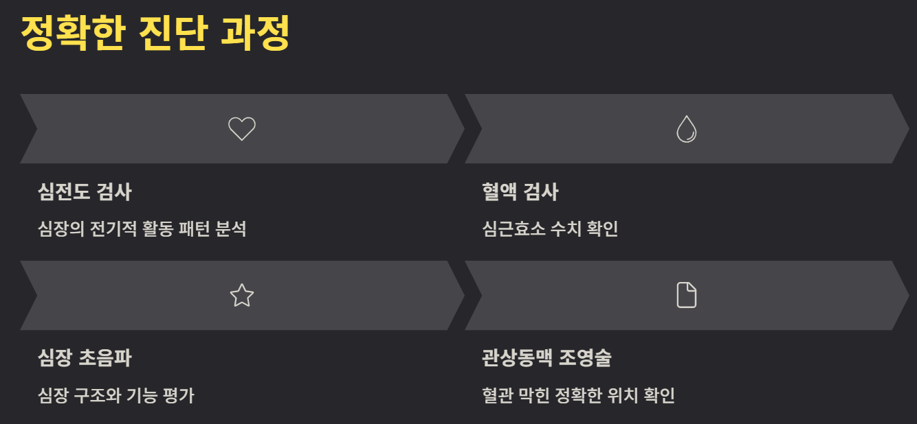 심전도 검사, 혈액검사(심근효소 수치), 심장 초음파, 관상동맥 조영술 등을 통해 진단합니다. 증상이 의심되면 지체 없이 응급실 방문이 중요합니다.