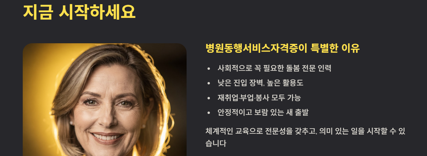 병원동행서비스자격증은 단순한 민간 자격을 넘어 사회적으로 꼭 필요한 돌봄 전문 인력으로 성장할 수 있는 기회를 제공합니다. 진입 장벽이 낮고 활용도가 높아 재취업, 부업, 봉사를 고민하는 분들에게 매우 적합한 선택입니다. 체계적인 교육과 자격증 취득을 통해 안정적이고 보람 있는 활동을 시작해 보시기 바랍니다.
