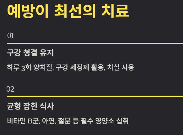 - 구강 청결 유지: 양치질과 구강 세정제를 활용.